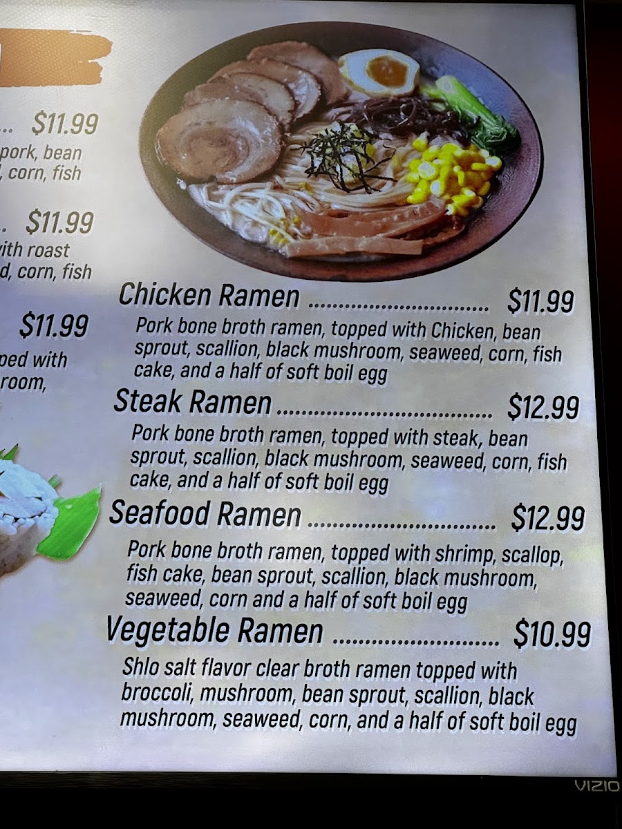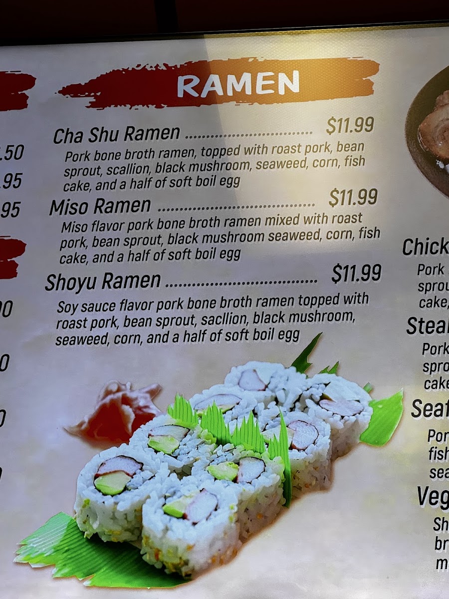 Pork bone broth ramen, topped with Hibachi Steak, bean sprout, scallion, black mushroom, seaweed, corn, fish cake and a half of soft boil egg